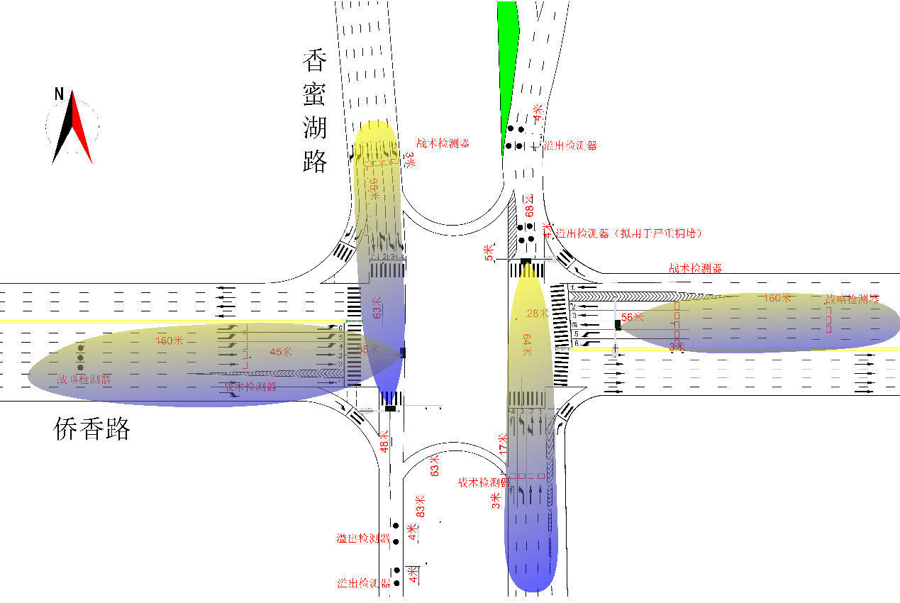 溢出检测器布设位置:在北出口68米处布设两排溢出检测器,每排检测器之间相隔4米,用于检测北出口的交通溢出状态;在南出口63米处布设两排溢出检测器,每排检测器之间相隔4米,用于检测南出口的交通溢出状态。通过雷视磁一体机接收溢出信号,传输给信号机。