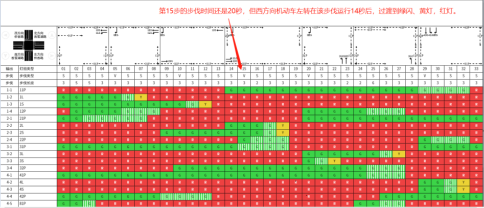 假设北方向出口产生缓行溢出,配置溢出流向为西机动车左转,运行时间比例为70%,则根据溢出流向找到对应的可变步伐第15步(假设当前配置方案该步伐长度为20秒),则第15步西机动车左转在该步伐的绿灯时间为14秒,然后过渡到绿闪、黄灯、红灯。