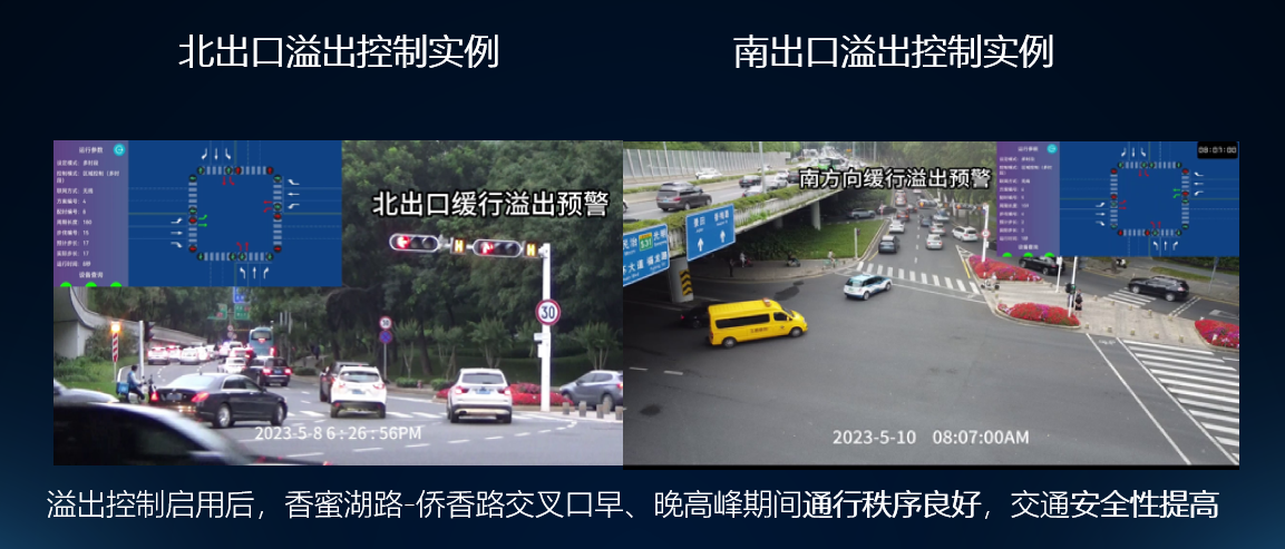 为解决侨香路-香蜜湖路交叉口早晚高峰溢流状况,防止锁死,解放警力,我们针对交叉口实际运行情况,设计溢出检测控制算法,可根据车流压占溢出情况,识别交通溢出状态,分等级输出溢出信号。溢出信号可分为缓行溢出、拥堵溢出、严重拥堵溢出三个等级。信号机根据每个方向对应的溢出等级分别可以配置对应的绿灯流向和该流向对应的绿灯放行比例。